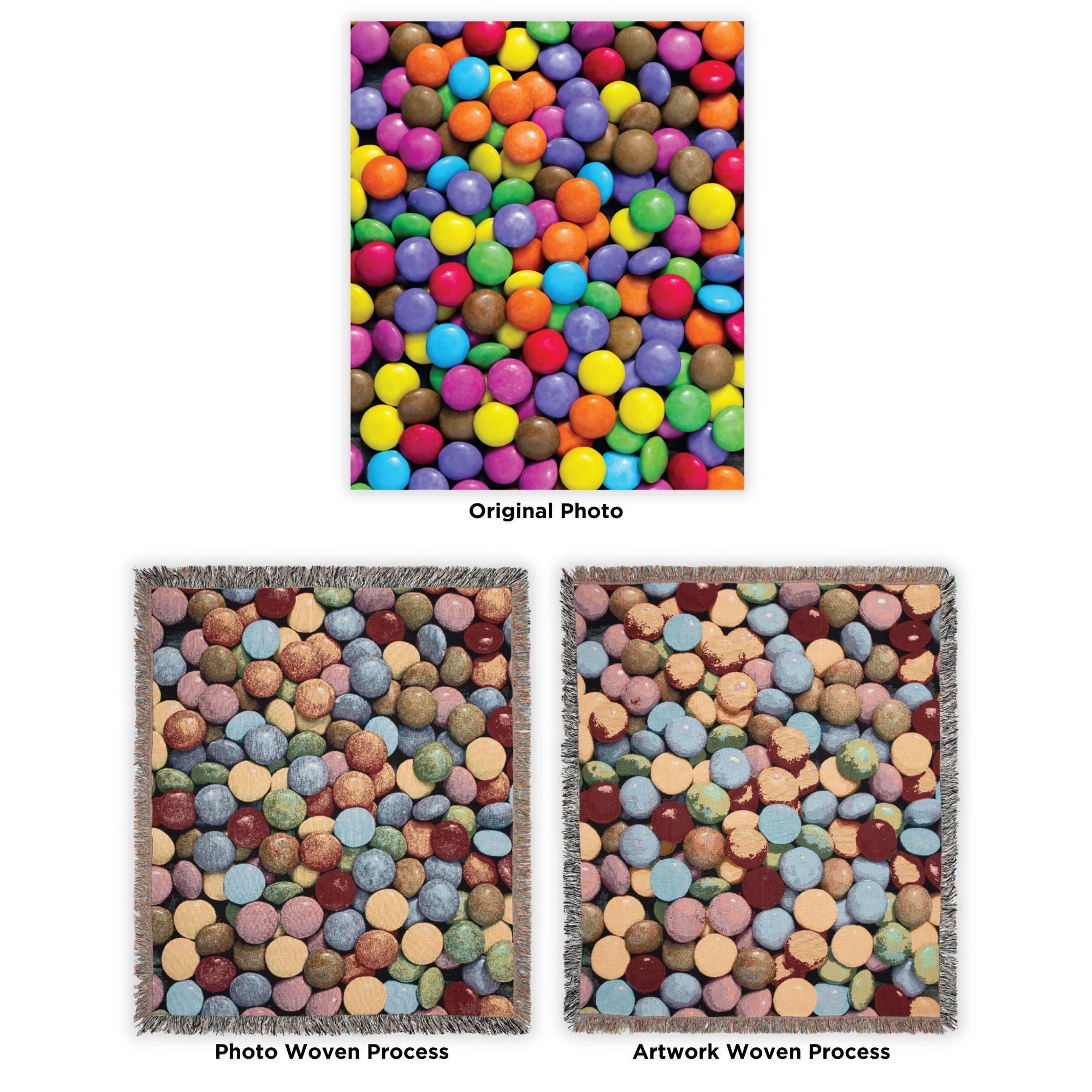 Bright, highly saturated images are mapped to the closest available yarn colors. Instead of neon intensity, the woven version becomes more muted, textured, and elevated—creating a cozy, vintage-inspired aesthetic that feels beautifully intentional.